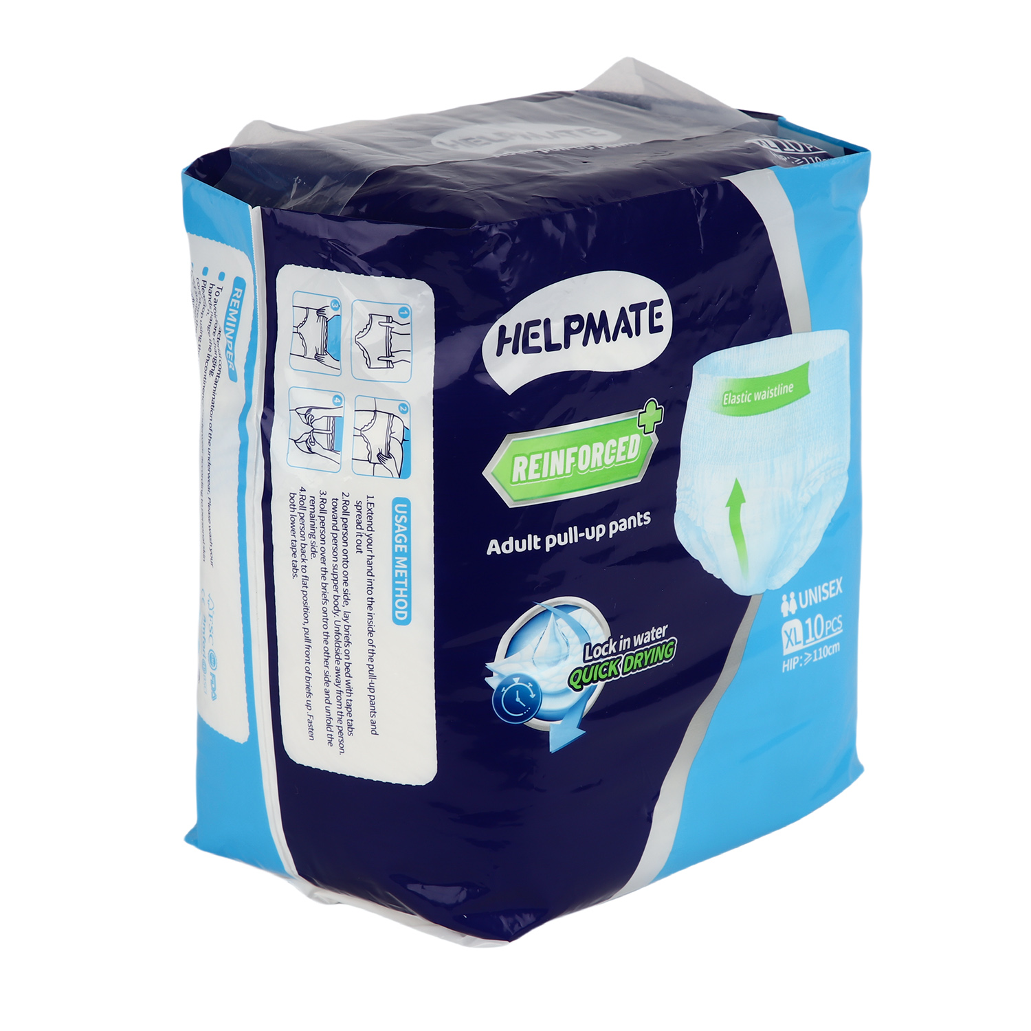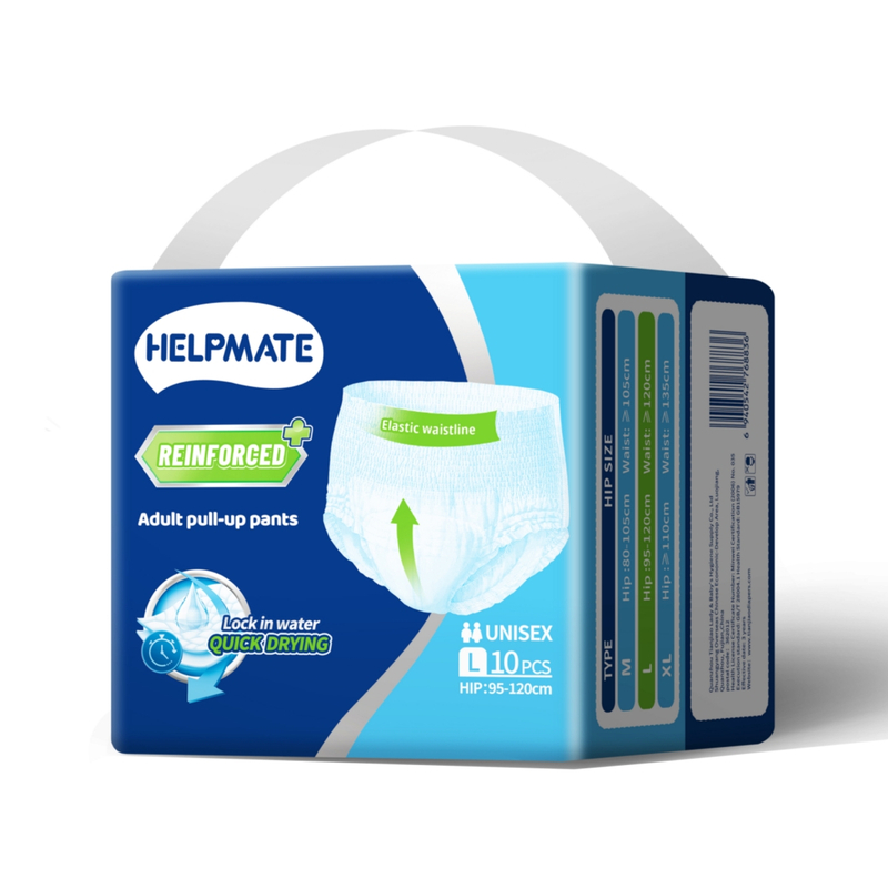 Los pañales Pull-Up para adultos Helpmate están cuidadosamente diseñados para ofrecer a los usuarios de edad avanzada y a los adultos que experimentan incontinencia una solución digna, cómoda y altamente absorbente. Con materiales suaves, una lámina trasera transpirable y protección antifugas, nuestros pantalones para adultos soportan tanto el uso diario como el uso nocturno. Confiado por los cuidadores, adecuado tanto para usuarios activos como encamados.