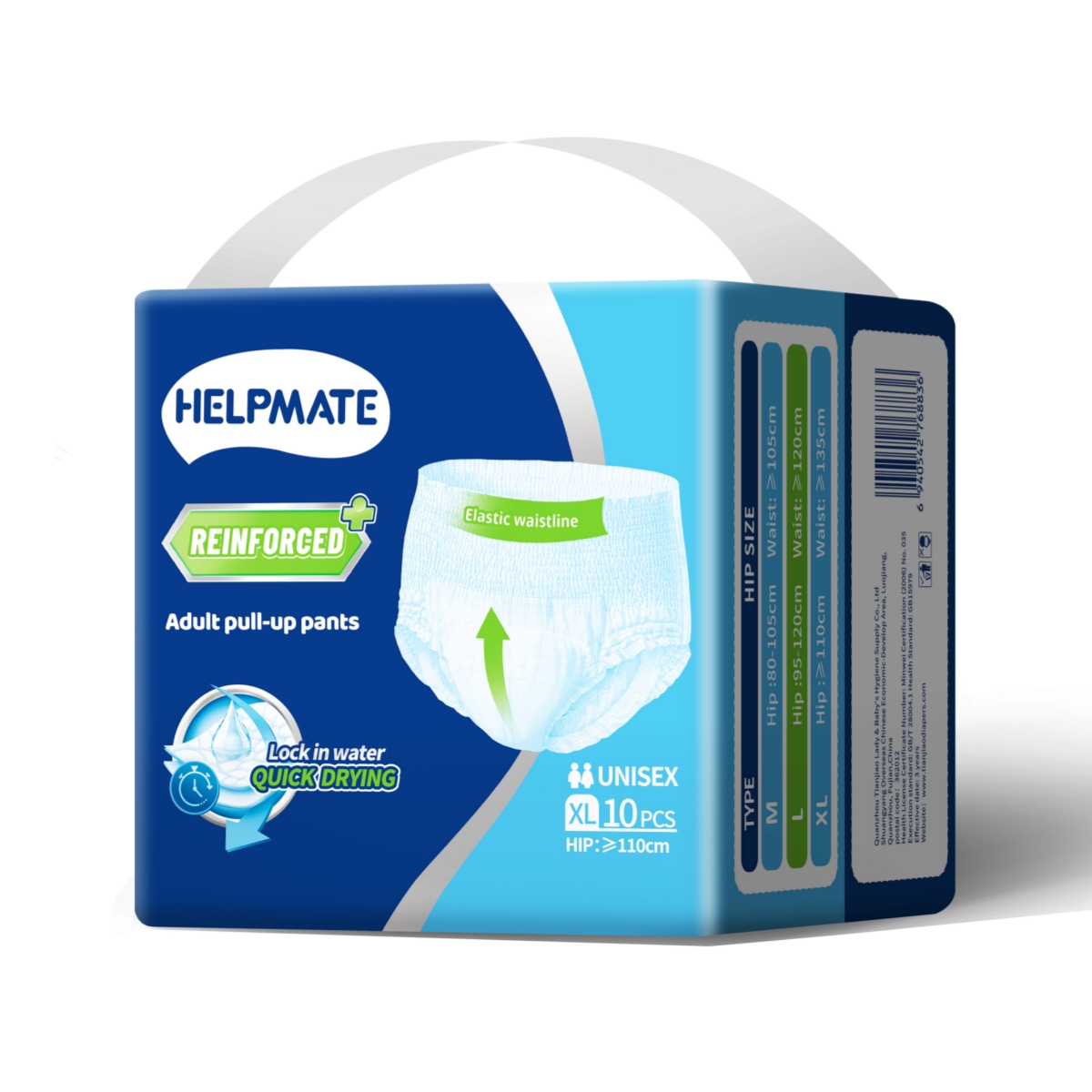 Los pañales Pull-Up para adultos Helpmate están cuidadosamente diseñados para ofrecer a los usuarios de edad avanzada y a los adultos que experimentan incontinencia una solución digna, cómoda y altamente absorbente. Con materiales suaves, una lámina trasera transpirable y protección antifugas, nuestros pantalones para adultos soportan tanto el uso diario como el uso nocturno. Confiado por los cuidadores, adecuado tanto para usuarios activos como encamados.